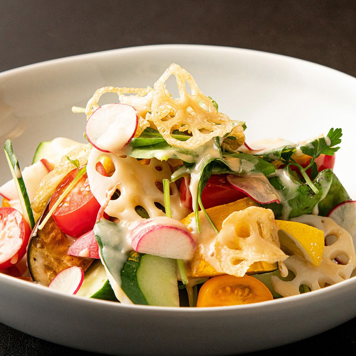 ソテーした玉ねぎ、黒酢、はちみつのコクと旨味。酸味を抑えたドレッシングです。